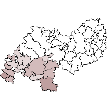 Durch Mausklick auf die gewünschte Partei wird der Stimmenanteil in % durch farbliche Abstufung in der Landkarte dargestellt.