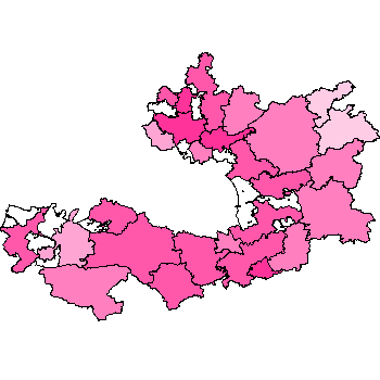 Durch Mausklick auf die gewünschte Partei wird der Stimmenanteil in % durch farbliche Abstufung in der Karte dargestellt.