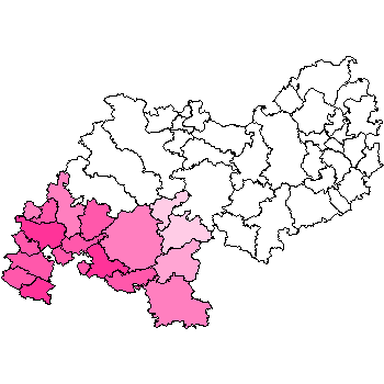 Durch Mausklick auf die gewünschte Partei wird der Stimmenanteil in % durch farbliche Abstufung in der Karte dargestellt.